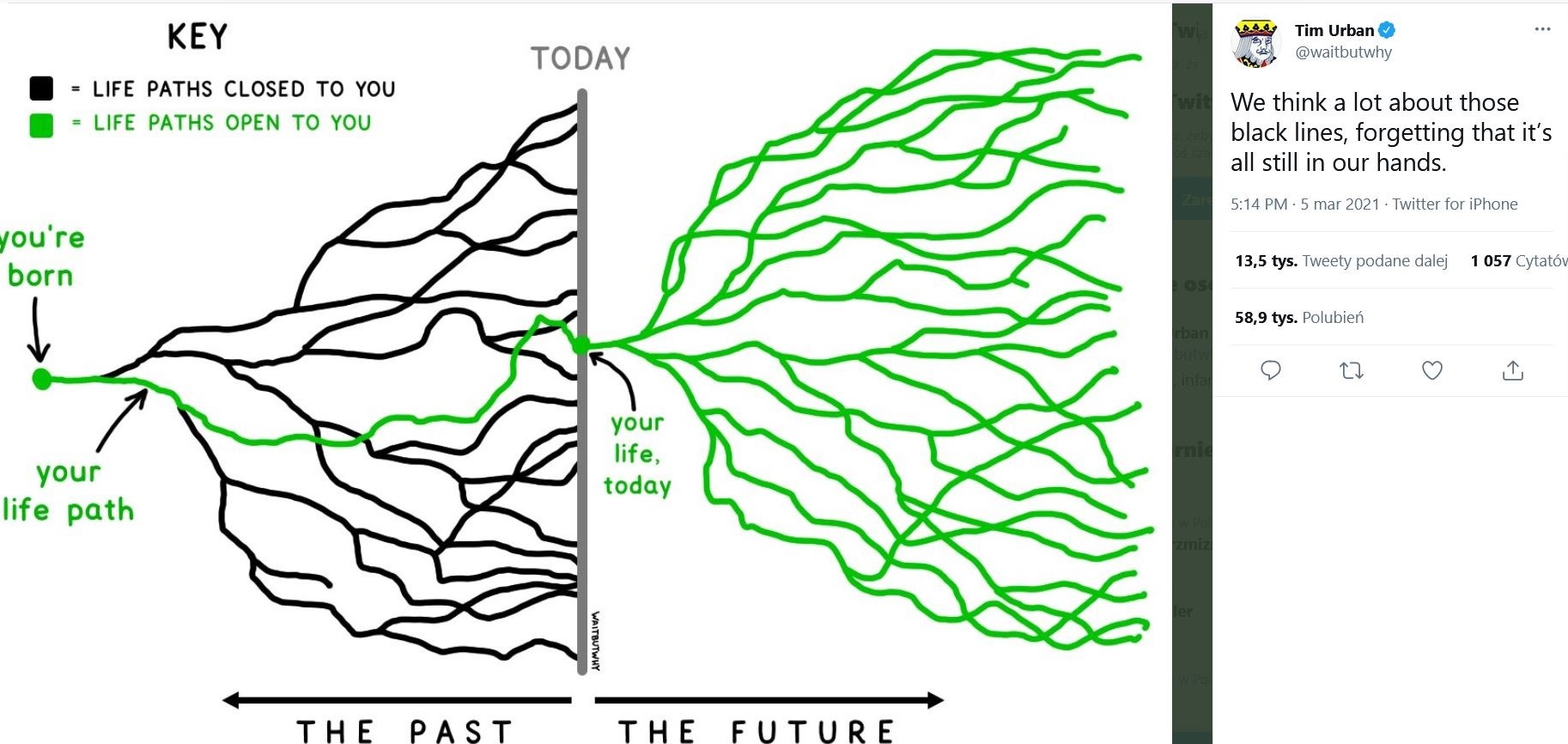 Każdemu, kto uległ takim „podszeptom” lub jest tego bliski polecam genialny w swej prostocie, ale potężny w wydźwięku wpis Tima Urbana zamieszczony na Twetterze. Widoczny rysunek okrasza komentarz „Dużo myślimy o tych czarnych liniach, zapominając, że to wszystko wciąż jest w naszych rękach.”