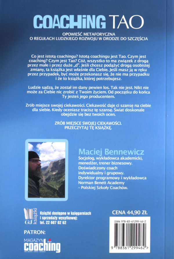 Taka jest też książka Macieja Bennewicza „COACHING TAO” którą gorąco polecam. W podtytule została ona określona mianem opowieści metaforycznej o regułach ludzkiego rozwoju w drodze do szczęścia i choć może ten opis brzmi poważnie i napuszenie, to zapewniam że autor w sposób wyjątkowo swobodny i przystępny snuje swoją fascynującą opowieści pełną ciekawych historii i zaskakujących zwrotów akcji. Nie znajdziemy tu sztywnych reguł, gotowych formułek choć chętni na końcu każdego rozdziału znajdą propozycje ciekawych ćwiczeń.